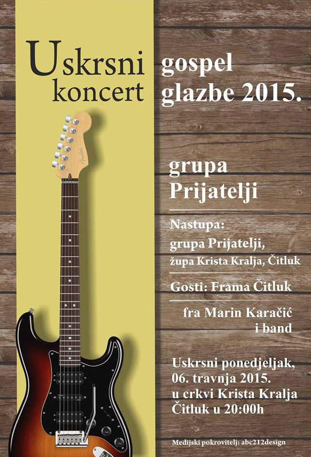 Pozivamo vas na uskrsni koncert zbora Prijatelji koji će se održati u ponedjeljak 6.4.2015. u župnoj crkvi Krista Kralja u Čitluku.