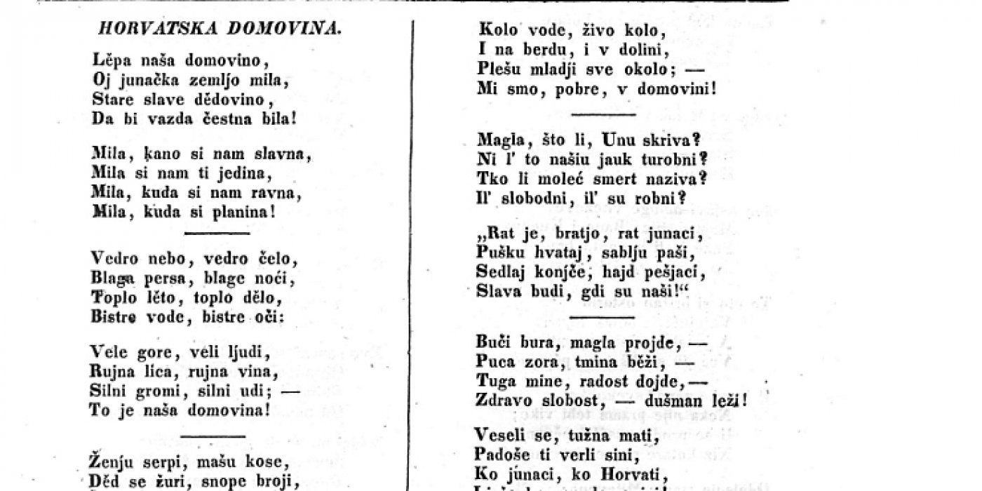 Prije točno 185 godina, 14. ožujka 1835., po prvi je put u listu Danicza Horvatzka, Slavonzka y Dalmatinzka objavljen tekst pjesme Antuna Mihanovića 'Horvatska domovina'. Riječ je o pjesmi koja je kasnije, u skraćenom obliku postala službenom himnom Republike Hrvatske, imena 'Lijepa naša domovino'.