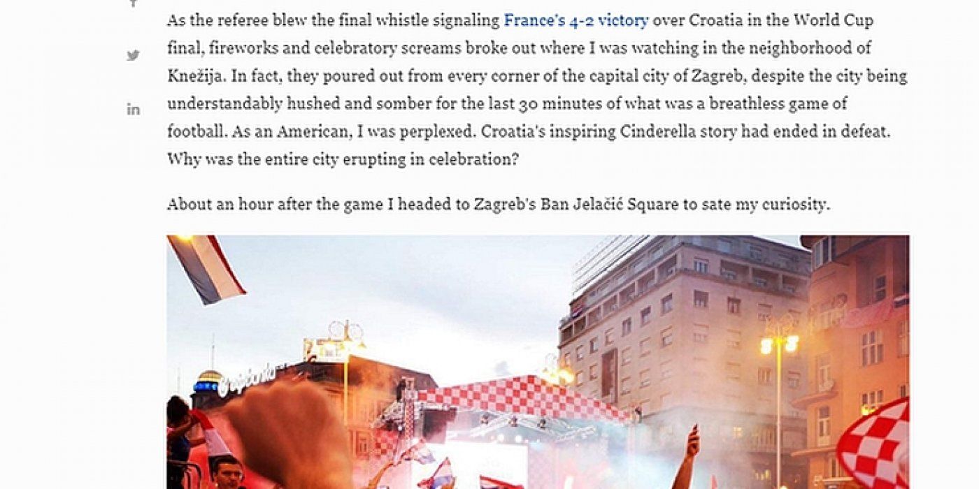 - Praćenje Svjetskog prvenstva u Hrvatskoj bilo je otrežnjujuće i posramljujuće iskustvo. U Americi ovakve poraze redovito prate neredi, kaos i nasilje. Vidjeti cijelu državu tako ujedinjenu u sportu, vidjeti njezin narod tako obavijen slavljem i srećom nakon nečega što se može označiti teškim porazom? Znati da doslovno svi koje sretnete na cesti ne samo da znaju što se dogodilo, nego su još ekstatični i tretiraju sve kao Božji dar. To je naprosto inspirirajuće. Poruke čestitanja koje vidite na Twitteru i Facebooku nisu jednodimenzionalne. To je i stvarni život. Fotografije koje vidite uz ovaj članak nisu odabrane kako bi se dokazala njegova poanta. One su tek veća, gušća reprezentacija hrvatskog stava u ovom trenutku. Ponos i duh koji ovi ljudi imaju je zarazan. Kladim se da će Hrvatska slaviti još dugo nakon što se utišaju tulumi u Francuskoj.