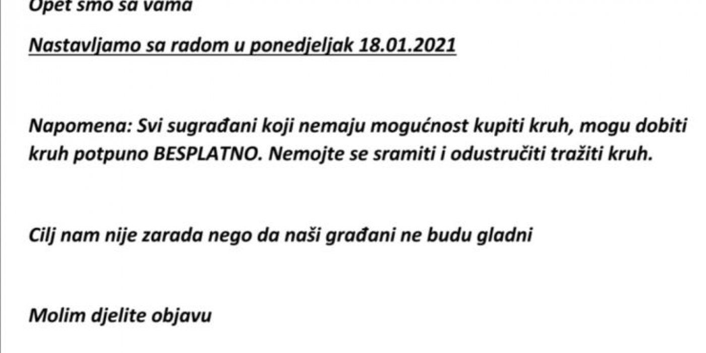 “Svi sugrađani koji nemaju mogućnost kupiti kruh, mogu dobiti kruh potpuno besplatno. Nemojte se sramiti i ustručavati tražiti kruh.”