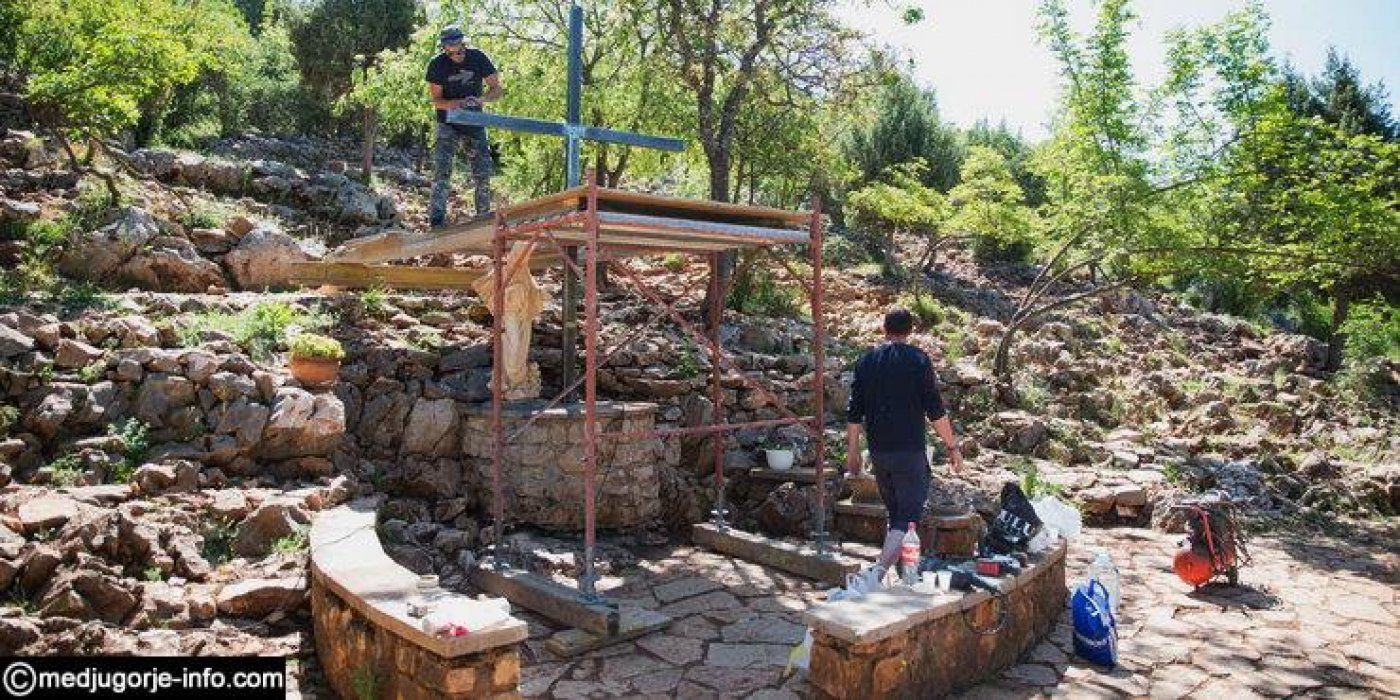 In questi giorni, quei pochi pellegrini o parrocchiani che sono andati a pregare sul Podbrdo, hanno notato che alcuni lavori venivano fatti intorno alla "Croce Blu" - e immediatamente sono iniziate varie speculazioni. In realtà è un'iniziativa da ordinare questo luogo di preghiera preferito di Medjugorje avviato da un giovane, un parrocchiano, di nome ANTE BREČIĆ (figlio del defunto Nedjeljko Brečić, che nei primi giorni dell'Apparizione diede al veggente Ivan l'idea di segnalare il luogo dell'apparizione della Madonna quando li avvertì di non scalare la Collina a causa della polizia, il quale ha anche deceduto immediatamente dopo l'incontro del gruppo di preghiera (4 luglio 1999), diversi membri dell'Associazione Regina della Pace di Bijakovići e giovani della Comunità Cenacolo. Poiché, sia le croci che le statue della Madonna sono già logore nel tempo, i ragazzi le restaureranno, le coloreranno, sostituiranno le nuove statue della Madonna e sistemeranno i luoghi intorno a loro.