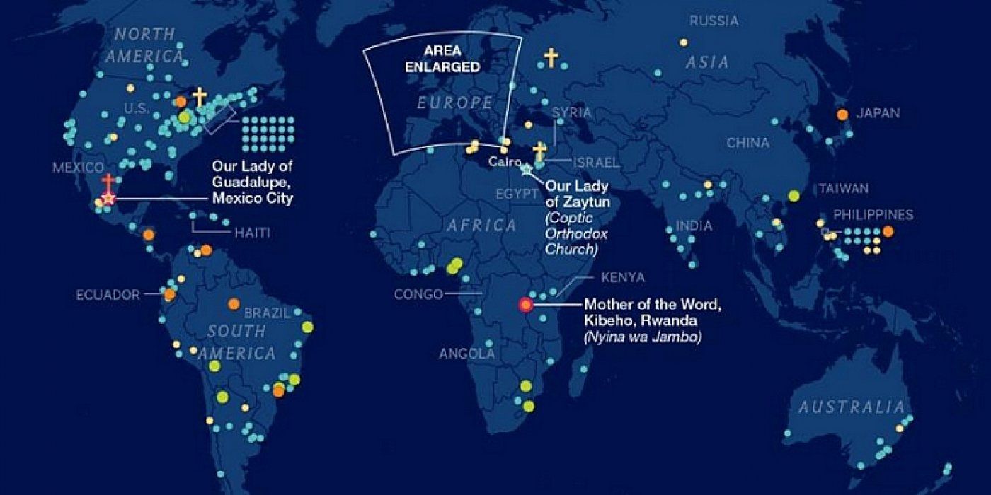 National Geographic izradio je kartu koja pokazuje gdje se nalaze marijanska svetišta. U Europi su omiljene destinacije Italija i Francuska, te južna Njemačka i Belgija. U tradicionalnim utvrdama kršćanstva Španjolskoj i Poljskoj marijanskih svetišta je relativno malo. Ima ih u zapadnoj Ukrajini, nešto u Mađarskoj, gotovo nijedno na Balkanu, osim Međugorja. U Irskoj za razliku od Velike Britanije ima daleko više dok u skandinavskim zemljama nisu zabilježena, piše Big Think,