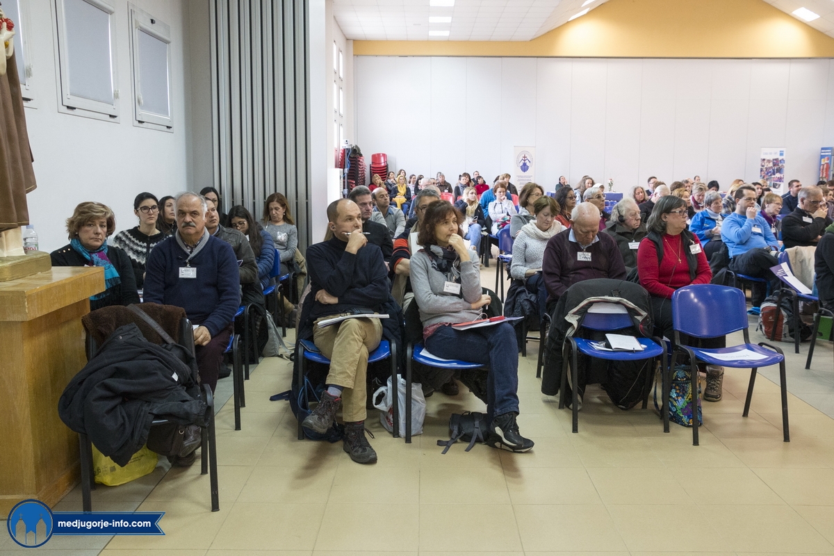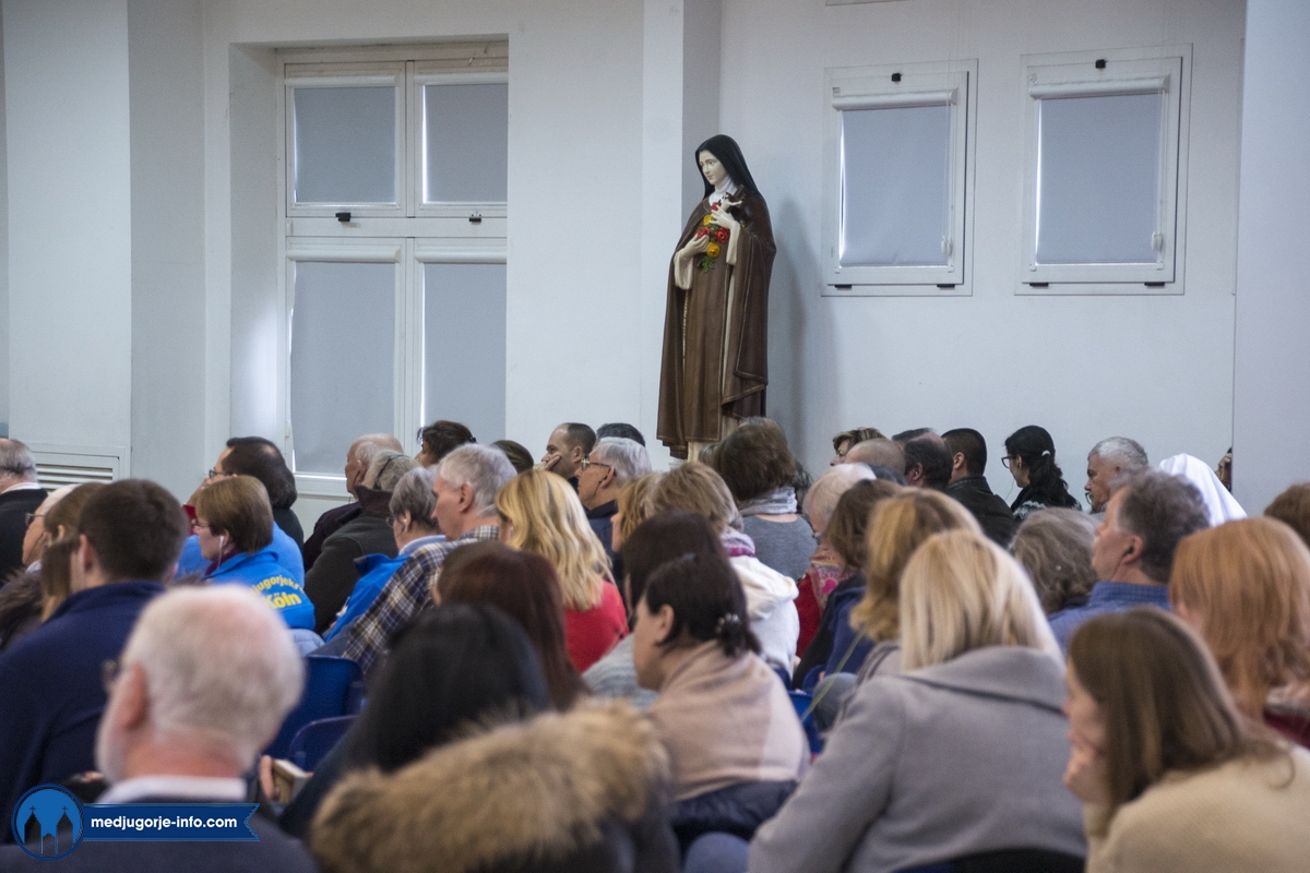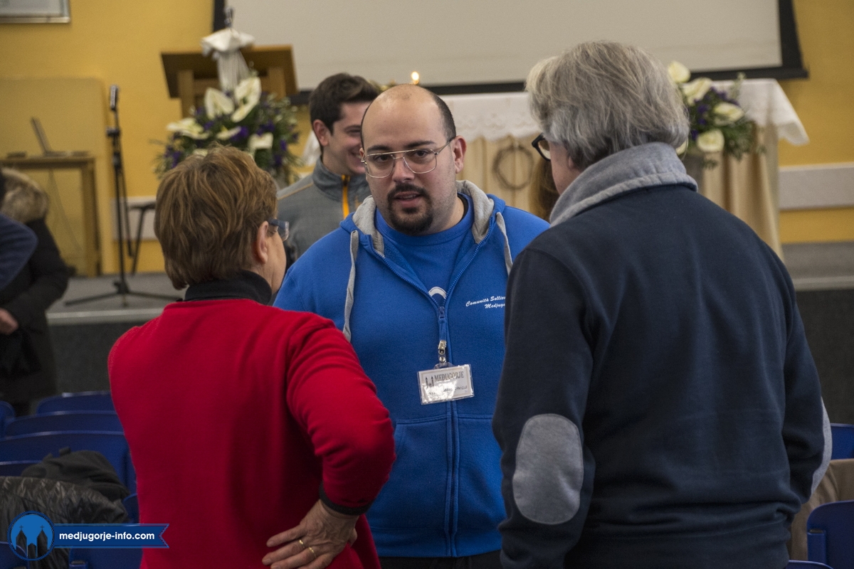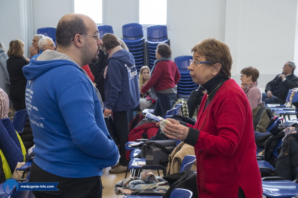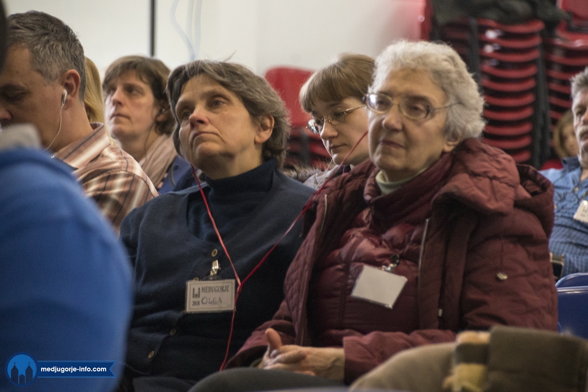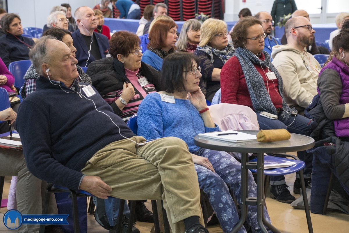 Na duhovnim vježbama je nešto manji broj sudionika nego prošlih godina, najvjerojatnije zbog loših, polarnih vremenskih uvjeta koji vladaju ovih dana i našim i Evropskim područjem. Jutrošnji program pratilo je 140-tak sudionika iz 11 govornih područja (talijanski (20), njemački (25), slovački (9), engleski (8), španjolski (10), ruski (14), ukrajinski (17), madžarski (7), poljski (17), hrvatski (1), francuski (9)). Započelo se molitvom: bilo je to klanjanje Presvetom, a nakon toga je fra Marinko održao predavanje koje je sve prisutne pozvalo na PUT PREMA SVETOSTI – a to je naime put življenja Gospinih poruka s onom voljom, odlukom, žarom, željom kao na počecima ukazanja.