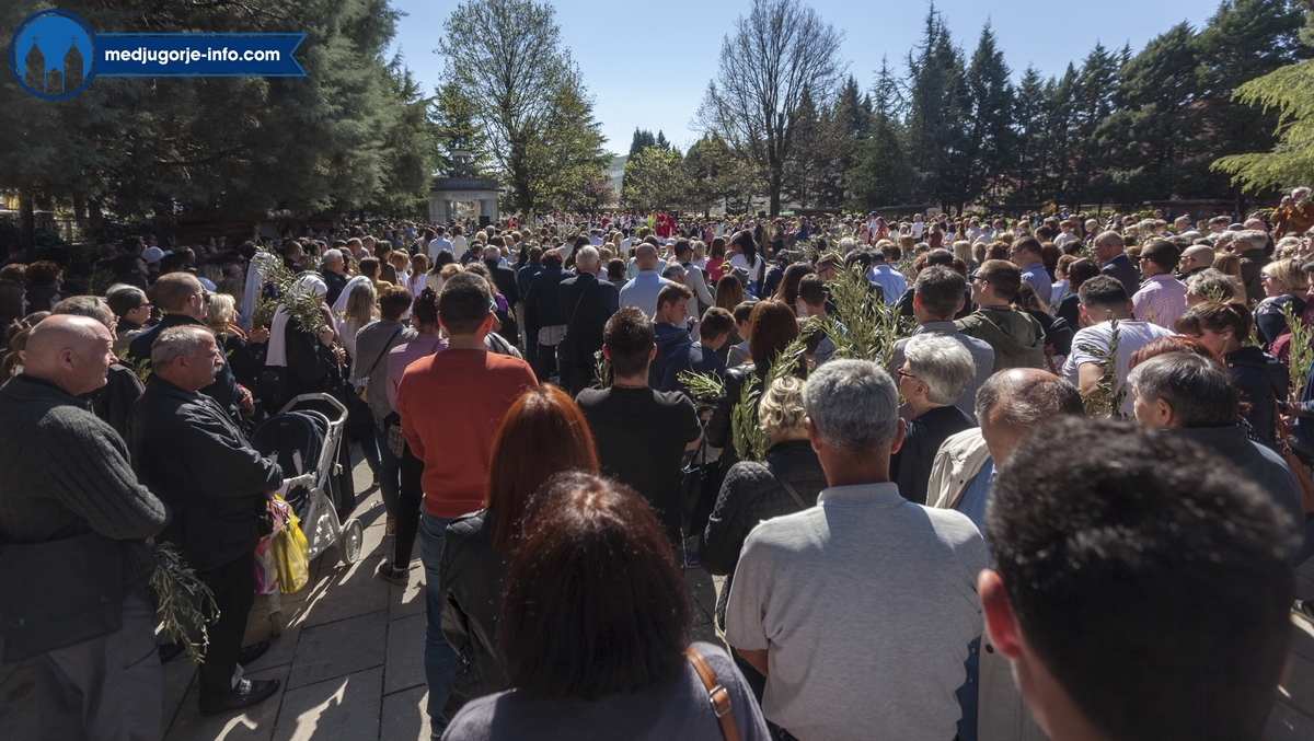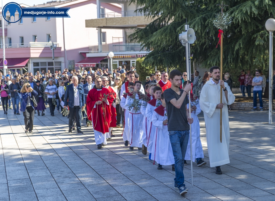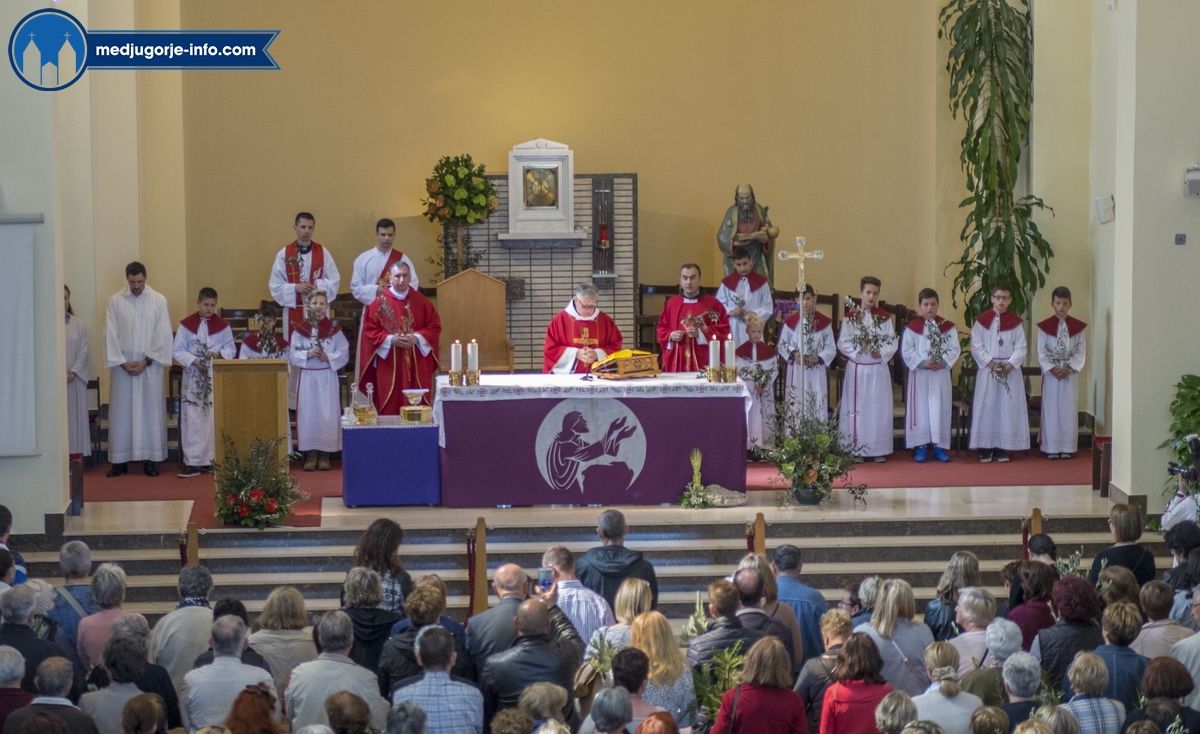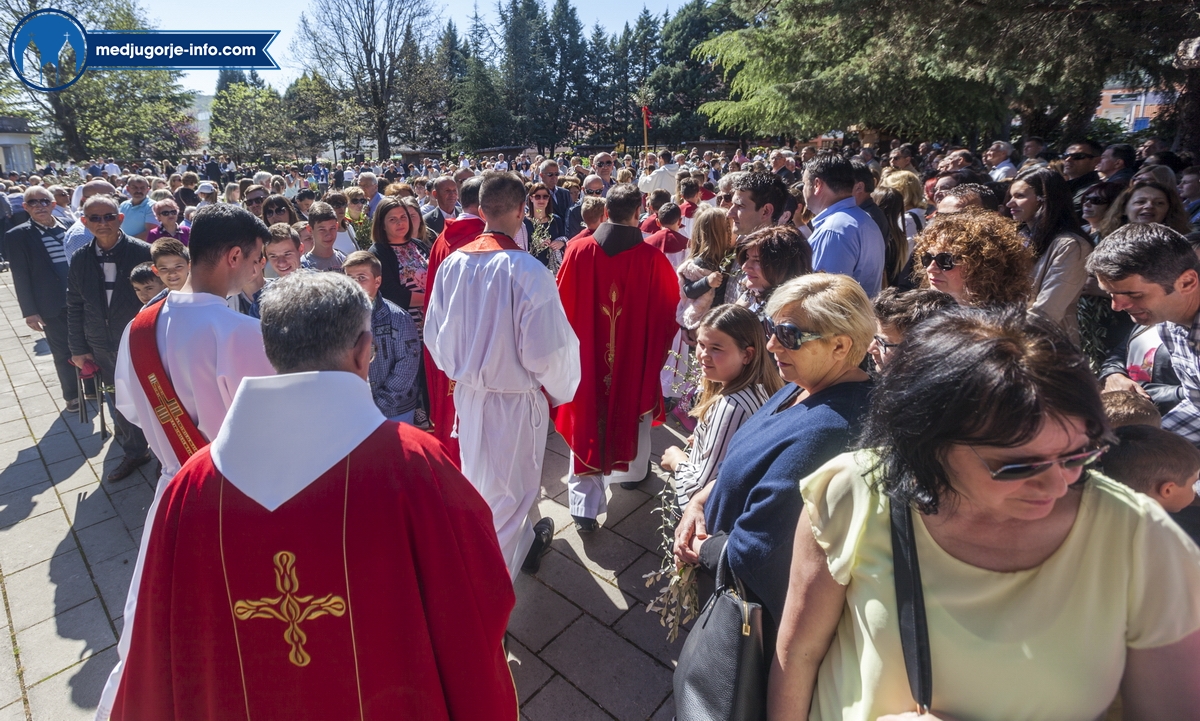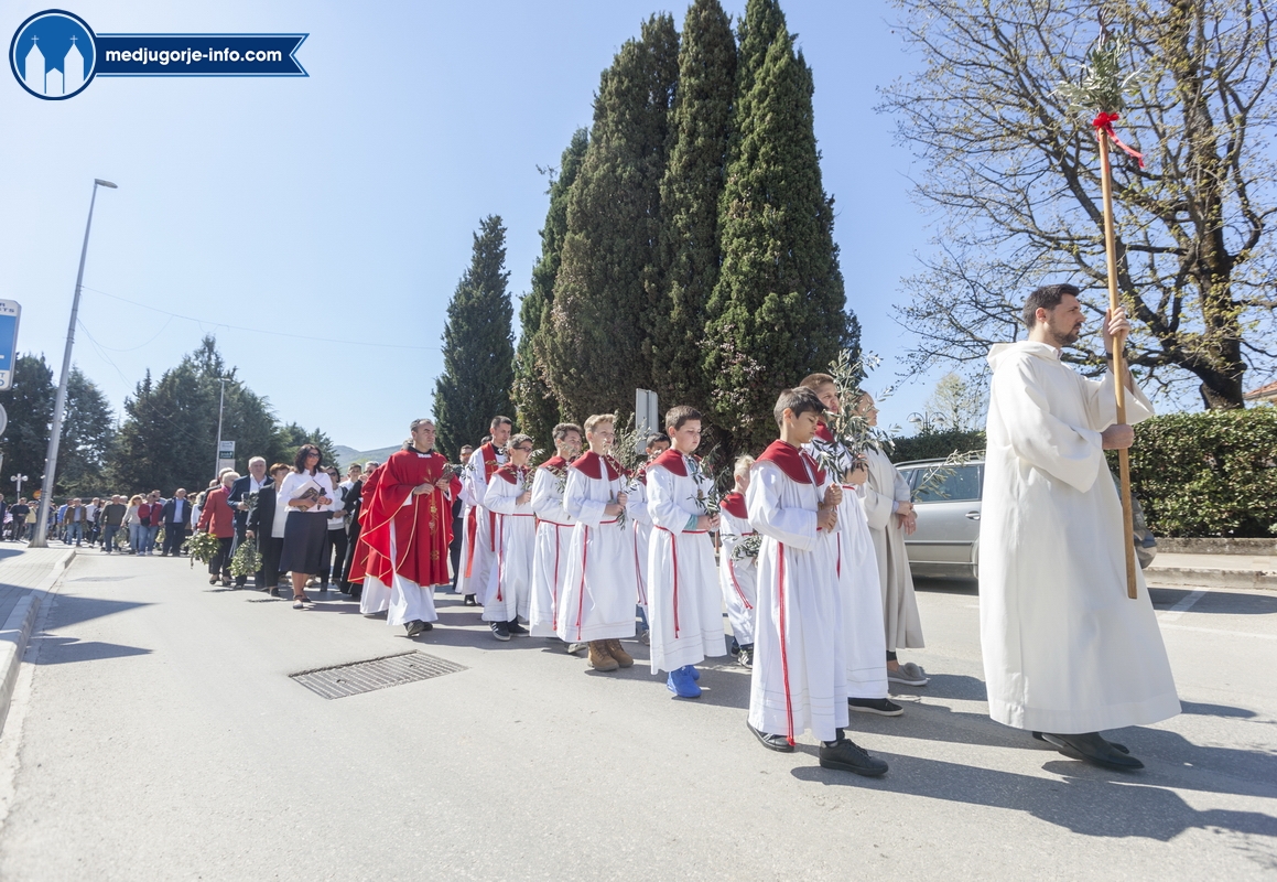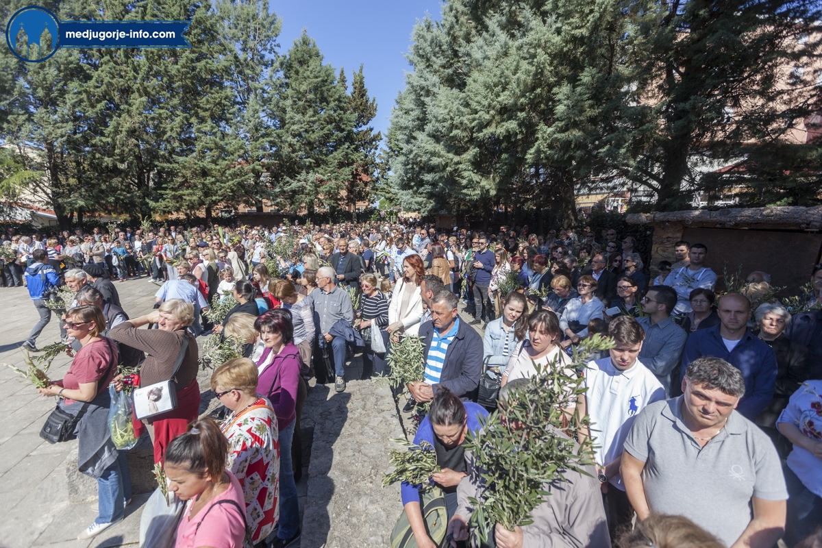 U Međugorju je liturgija Cvjetnice započela na temeljima stare župne crkve u 10,45 sati gdje su župljani i mnogi hodočasnici blagoslovili svoje maslinove grančice. Nakon toga se u procesiji išlo u župnu crkvu gdje se slavila sv. Misa Muke Gospodnje. Misno slavlje u crkvi sv. Jakova predslavio je fra Karlo Lovrić .