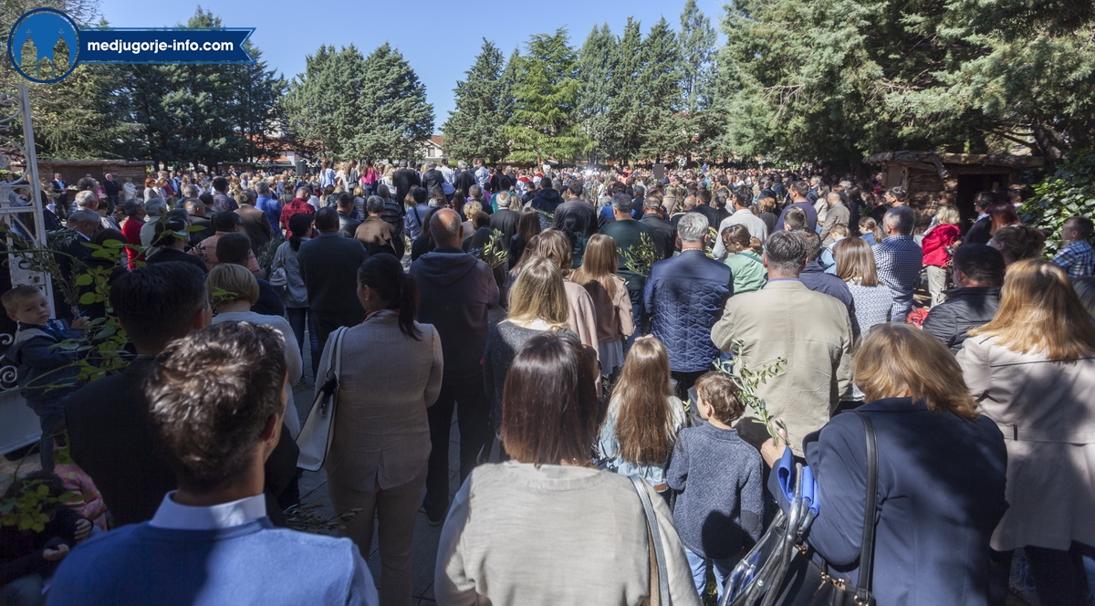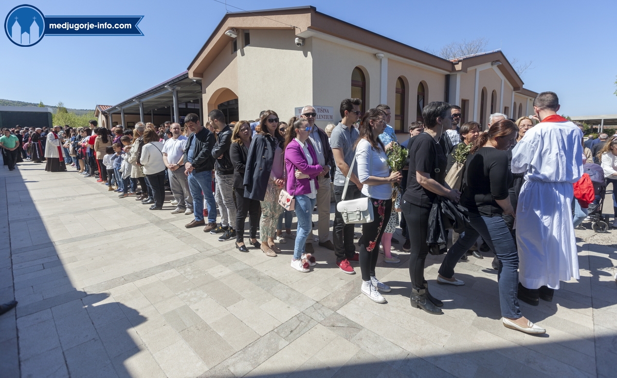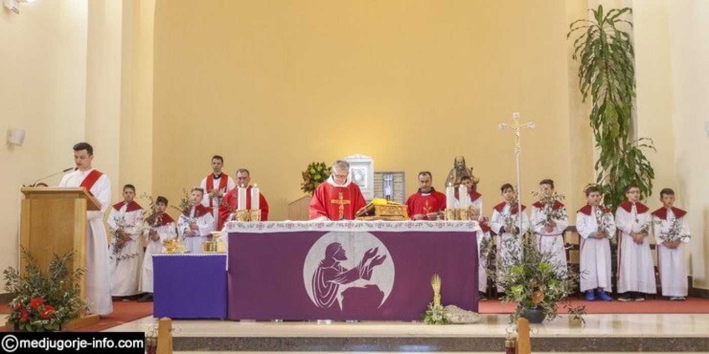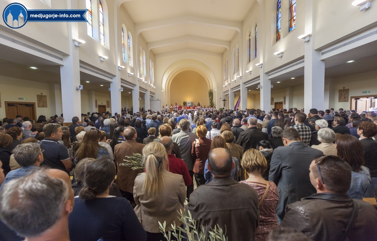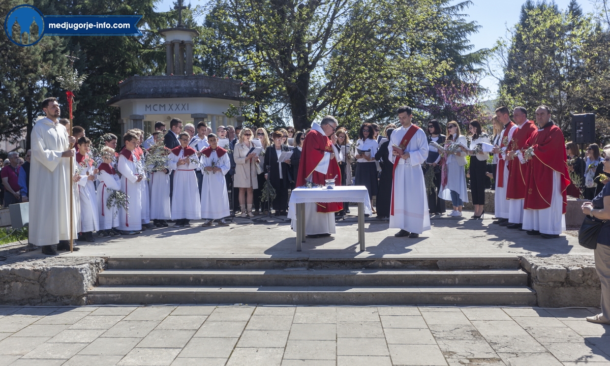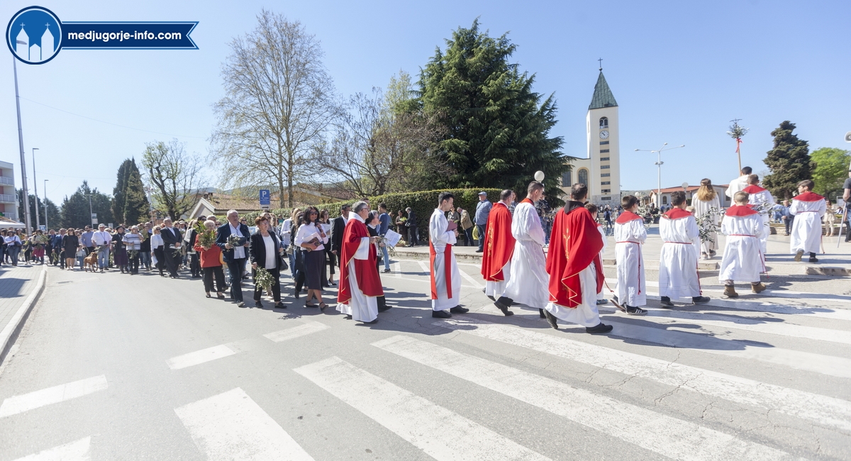 U Međugorju je liturgija Cvjetnice započela na temeljima stare župne crkve u 10,45 sati gdje su župljani i mnogi hodočasnici blagoslovili svoje maslinove grančice. Nakon toga se u procesiji išlo u župnu crkvu gdje se slavila sv. Misa Muke Gospodnje. Misno slavlje u crkvi sv. Jakova predslavio je fra Karlo Lovrić .