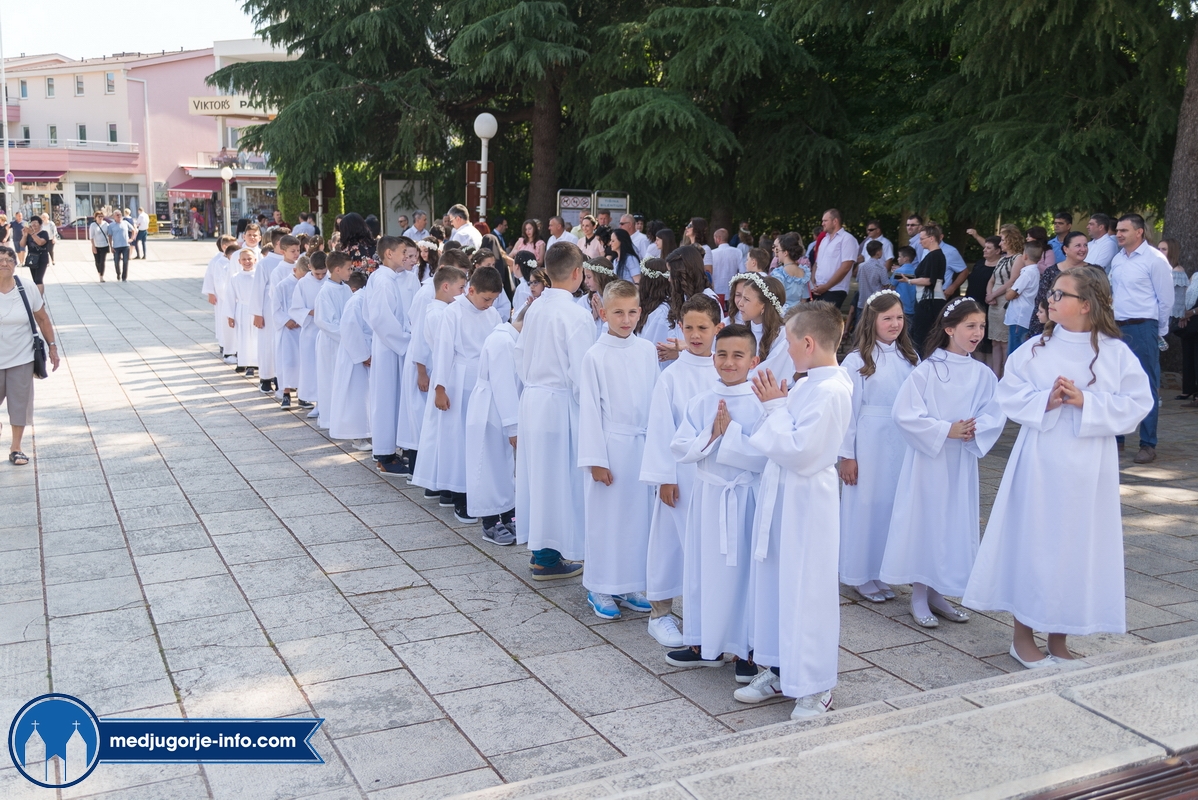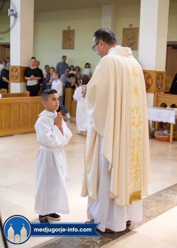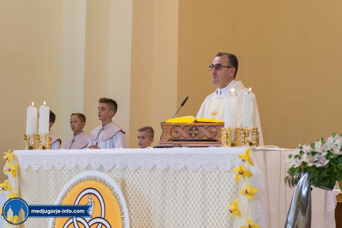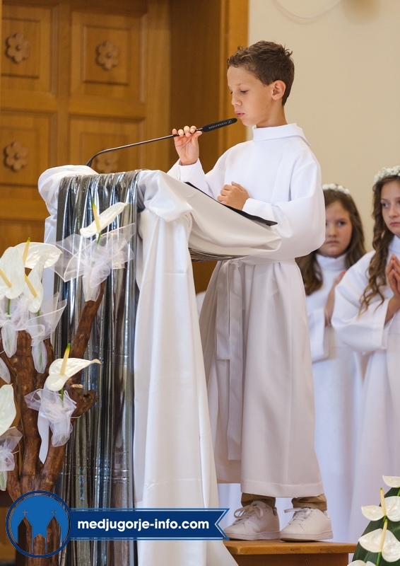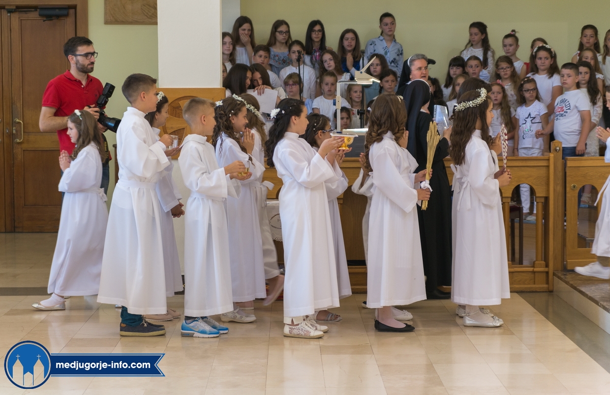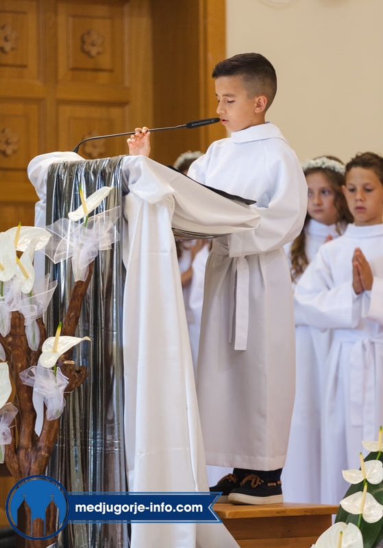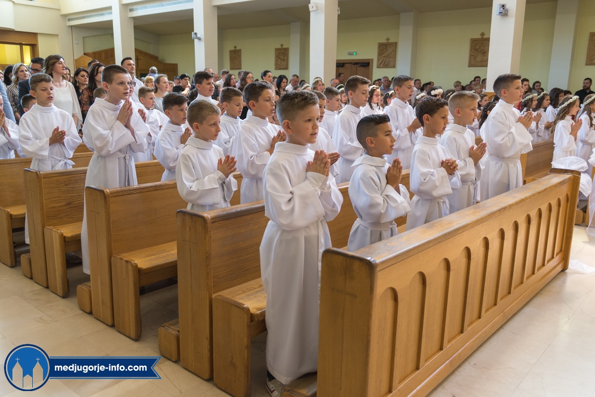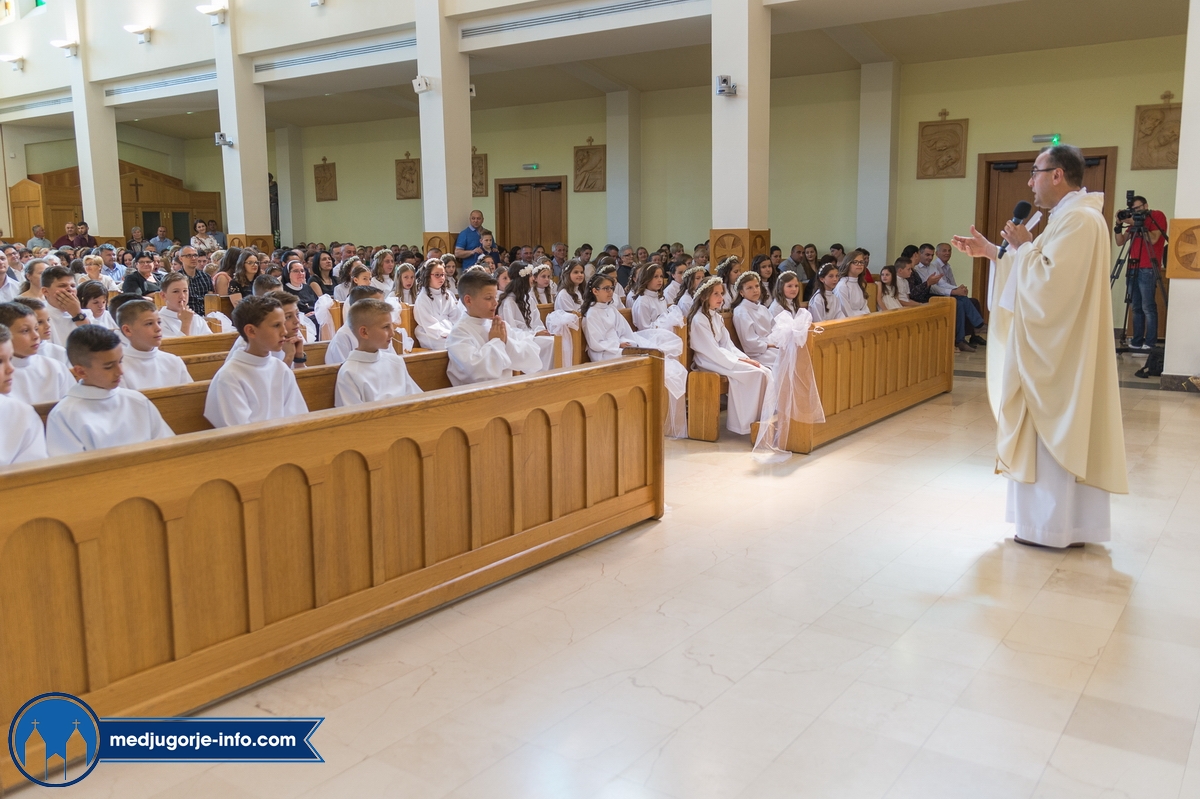 "Draga dječice, kako je lijepo biti danas ovdje u Božjem domu jedni s drugima i primiti Isusa. Danas slavimo svetkovinu Presvetog trojstva, zato smo na početku načinili znak križa. To je jedan Bog, a u sebi je trojstvo", kazao je župnik fra Marinko Šakota.