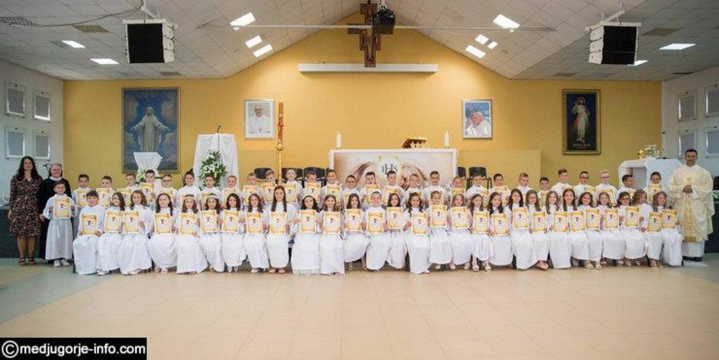 U dvorani Ivana Pavla II. sa raspoređenim mjestima kako bi se poštovao sigurnosni razmak, svečanu svetu misu predslavio je fra Zvonimir Pavičić, njihov vjeroučitelj. Prvopričesnike je za ovu svečanost pripremala časna sestra Irena Azinović i vjeroučiteljica Slađana Taisler. Slavlje je obogatio svojim pjevanjem dječji župni zbor «Golubići mira» pod ravnanjem časne sestre Irene Azinović. Uz prvopričesnike bili su i njihovi roditelji i najuža rodbina.