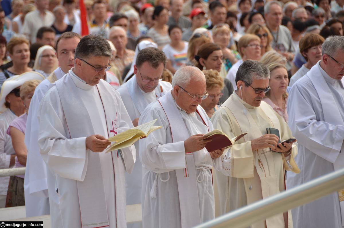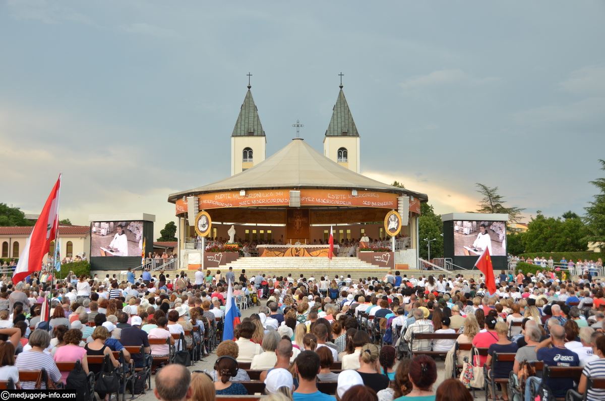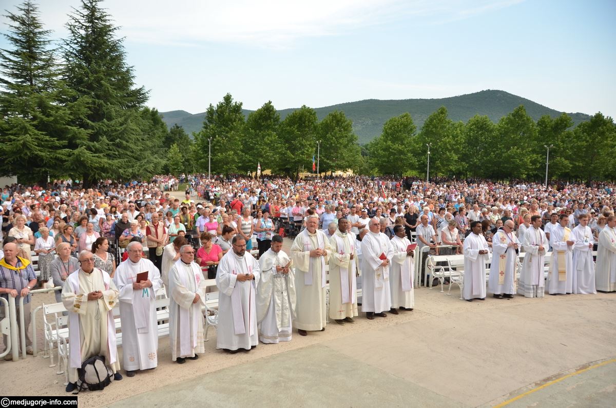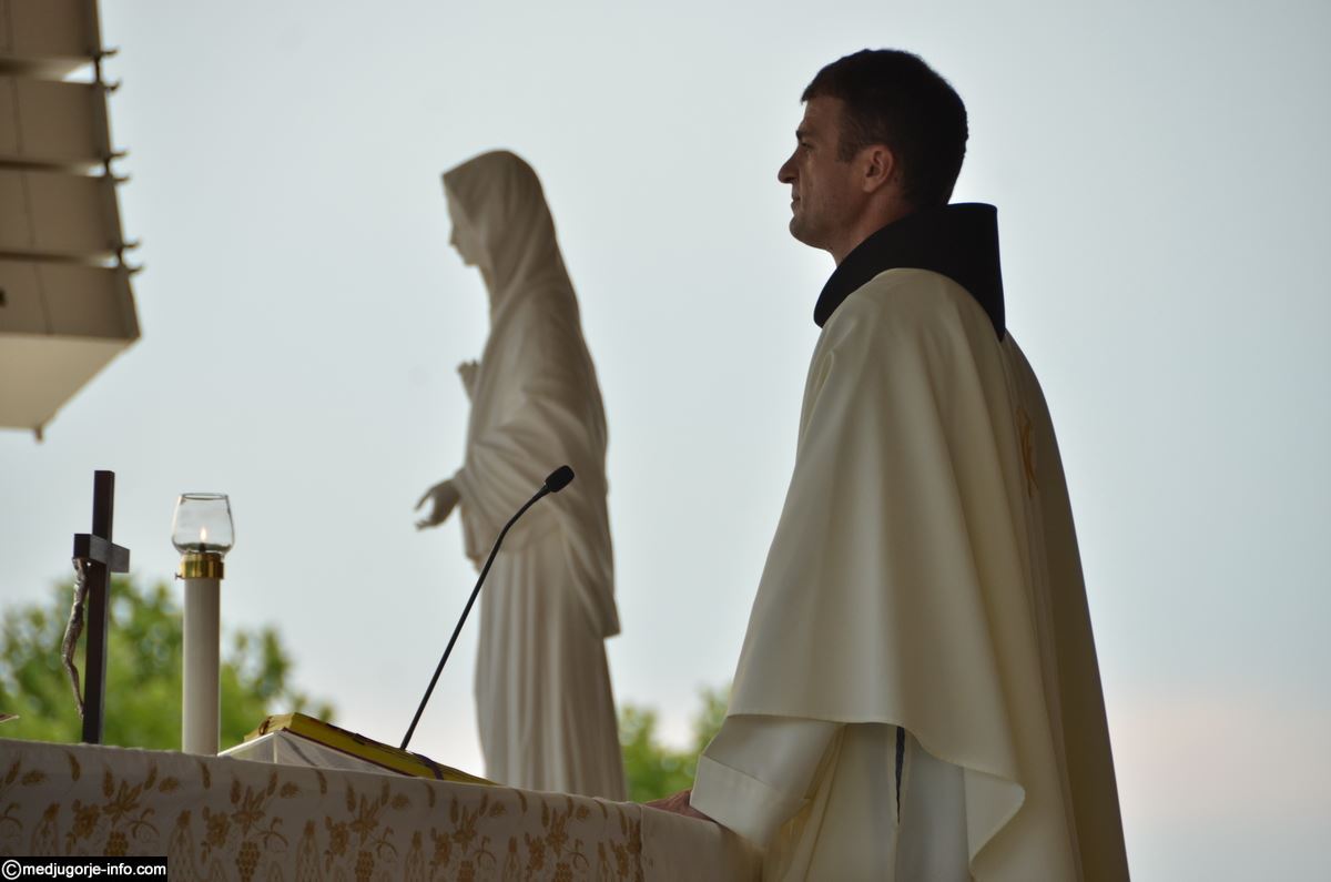 Večernju svetu misu na uočnicu Gospinih ukazanja u Međugorju na vanjskom oltaru crkve sv. Jakova predslavio je, u koncelebraciji 181 svećenika, fra Bože Milić, župni upravitelj župe sv. Mihovila Arkanđela, Drinovci. Misno je slavlje uveličao veliki zbor „Kraljice mira“ pod ravnanjem s. Irene Azinović. Fra Bože je u propovijedi, između ostalog istaknuo: „Draga braćo i sestre, došli smo ovdje i u svojim torbama, ruksacima, u svojim automobilima, sa svojim obiteljima i prijateljima, muževima i ženama, djevojkama i mladićima, donijeli svoje živote, a negdje u nekom kutku, u dubini svoga srca, nosimo i svoje želje, molitve i zavjete. Došli smo ovdje moliti Gospodina da nam učini, da nam učini nešto po zagovoru Kraljice mira, po zagovoru sv. Ivana i sv. Jakova zaštitnika ove župe. Utječemo se zagovoru BDM, najvećeg i najljepšeg Božjeg stvorenja, i zagovoru sv. Ivana Krstitelja, najvećeg rođenog od žene. Došli smo puni vjere i pouzdanja Gospi na 35. obljetnicu njezinih ukazanja. Molimo Kraljicu mira da podari mir cijelom svijetu i svima koji mir traže. Molimo je za mir u našim obiteljima i našim srcima. Kakvo divno ime – Kraljica mira – i kako potrebno današnjem svijetu. Došli smo zahvaliti za sve milosti, nebrojene i preobilne, koje nam je Bog ovdje po Gospi dao. Ali došli smo moliti da nam i dalje bude utjeha i utočište, da nas vodi Isusu sigurnim putem, da nas hrabri, tješi, opominje i blagoslovi i dadne snage za život.
