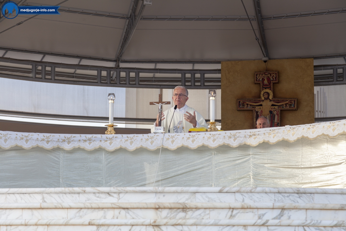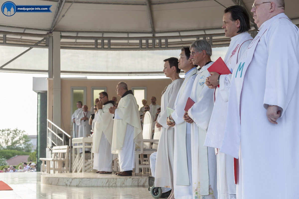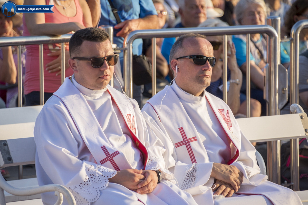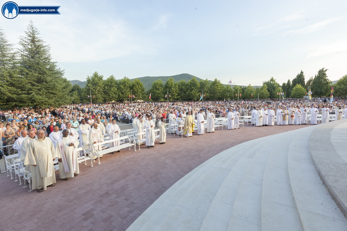 Večernju svetu misu na uočnicu Gospinih ukazanja u Međugorju na vanjskom oltaru crkve sv. Jakova predslavio je, u koncelebraciji 151-og svećenika, fra Mate Dragičević.