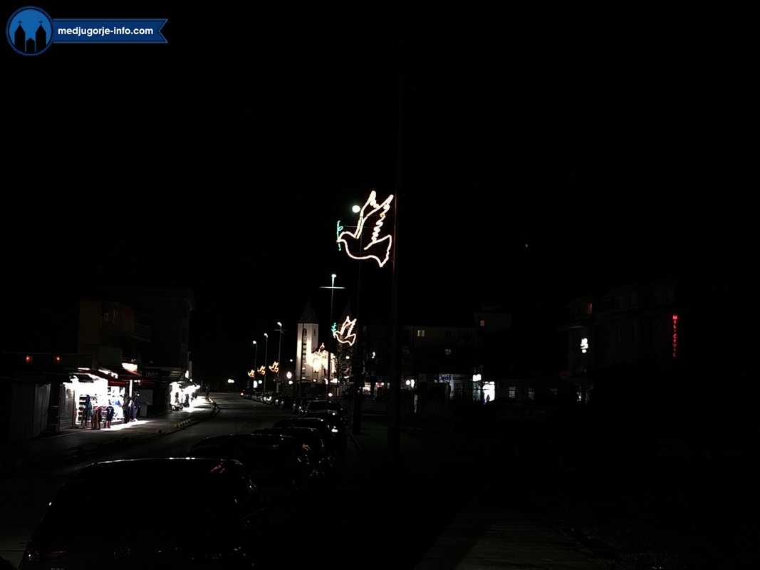 Ukrašena je glavna ulica koja vodi do crkve sv. Jakova u Međugorju. A cijela župa dobiva novi blagdanski izgled. Naime, veliki elektro stupovi ukrašeni su prekrasnim pticama koje nose grančicu masline u kljunu. Simbol je to mira kojim zrači ovo mjesto molitve i pomirenja. Inače, tijekom božićnih i novogodišnjih blagdana koji se približavaju međugorskom svetištu vladat će uobičajeno ozračje mira, molitve i zajedništva među vjernicima koji će pristići sa svih strana svijeta i blagdane dočekati u ovom mjestu molitve i pomirenja…