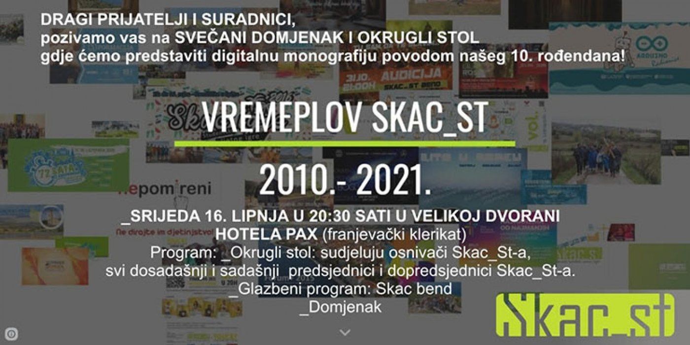 Ovim mailom šaljemo Vam molbu da objavite poziv na SVEČANO PREDSTAVLJANJE DIGITALNE MONOGRAFIJE "VREMEPLOV SKAC_ST-a 2010.-2020. te nam tako pomognete u promociji događaja. Još jednom zahvaljujemo na svakoj dosadašnjoj objavi kojom ste podržali naš rad i djelovanje.