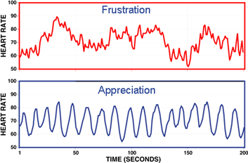 1) Grafikon HeartMath instituta prikazuje očitanje monitora srca - ritam srca kad je osoba frustrirana i kad je zahvalna.