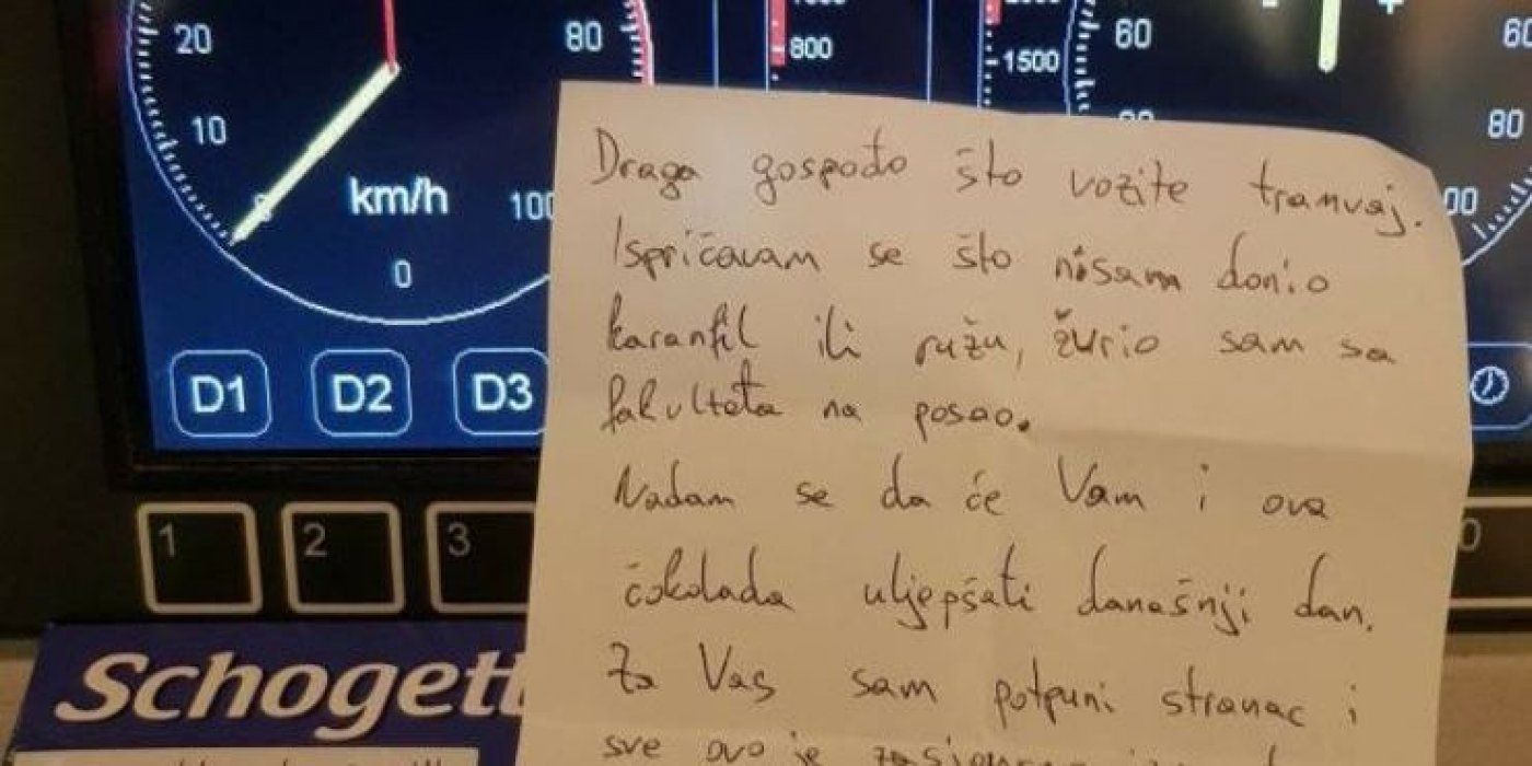 Na Facebook stranici ‘Zakaj volim Zagreb’ osvanula je fotografija pisma koje je jedna vozačica dobila od putnika. Uz pismo je dobila i čokoladu, a u pismu piše: ‘Draga gospođo što vozite tramvaj. Ispričavam se što nisam donio karanfil ili ružu, žurio sam s fakulteta na posao. Nadam se da će Vam i ova čokolada uljepšati današnji dan. Za Vas sam potpuni stranac i sve ovo je zasigurno iznenađenje. Sreća je u malim stvarima, hvala Vam što savjesno i odgovorno vozite tramvaj. Jedino što ćete saznati o meni je M. T. Iza tih inicijala krije se moja malenkost. Sretan vam Dan žena!!!’.