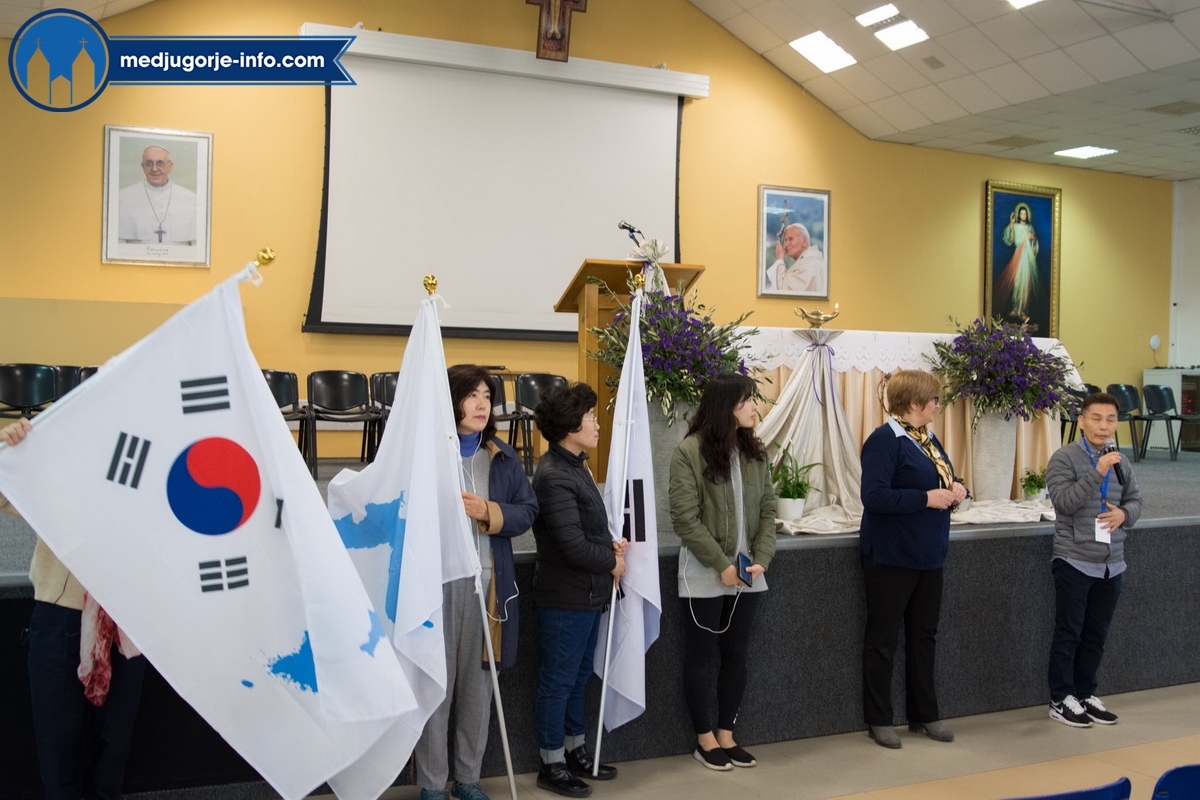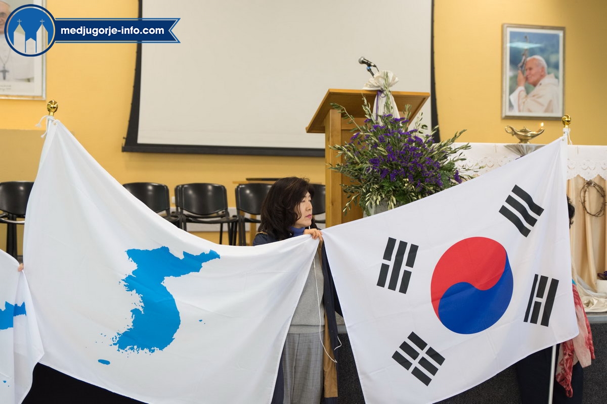 KOREJSKI HODOČASNICI: U sječnju 2018. godine u Koreji je boravio fra Danko Perutina koji je tamo u 6 Biskupija održao različite edukativne i molitvene susrete sa vjernicima koji su članovi međugorskih molitvenih skupina. I dao im je u zadatak da slijedeće godine (tj. 2019.) donesu u Medjugorje zastavu na kojoj će biti slika ujedinjenih Koreja – cijelog Korejskog poluotoka. I evo donijeli smo ovu zastavu kao vidljivi znak naše molitvene nakane da Sjeverna i Južna Koreja postanu jedno. Podsjećamo da su s tom nakanom korejski hodočasnici poklonili i Gospin kip koji se nalazi na Podbrdu.