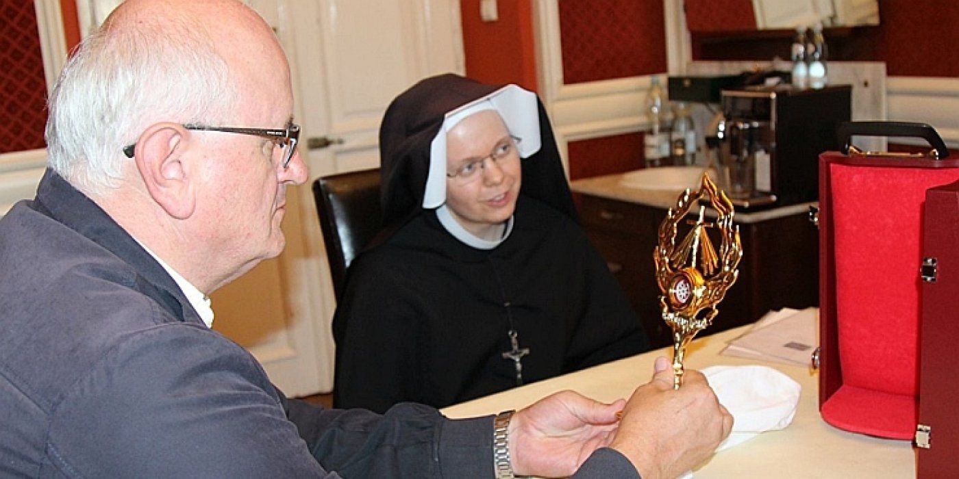 Relikviju je osobno preuzeo upravitelj Duhovnog centra i duhovnik Pokreta Božjeg milosrđa vlč. Miro Tomas, u nedjelju, 22. rujna u Svetištu Božjeg Milosrđa u poljskome gradu Krakovu, a predala mu ju je s. Norberta Ruchala ZMBM, uime Časne Majke poglavarice Družbe sestara Gospe od Milosrđa. Primopredaji relikvije nazočilo je 60-ak hodočasnika s područja Đakovačko-osječke nadbiskupije.