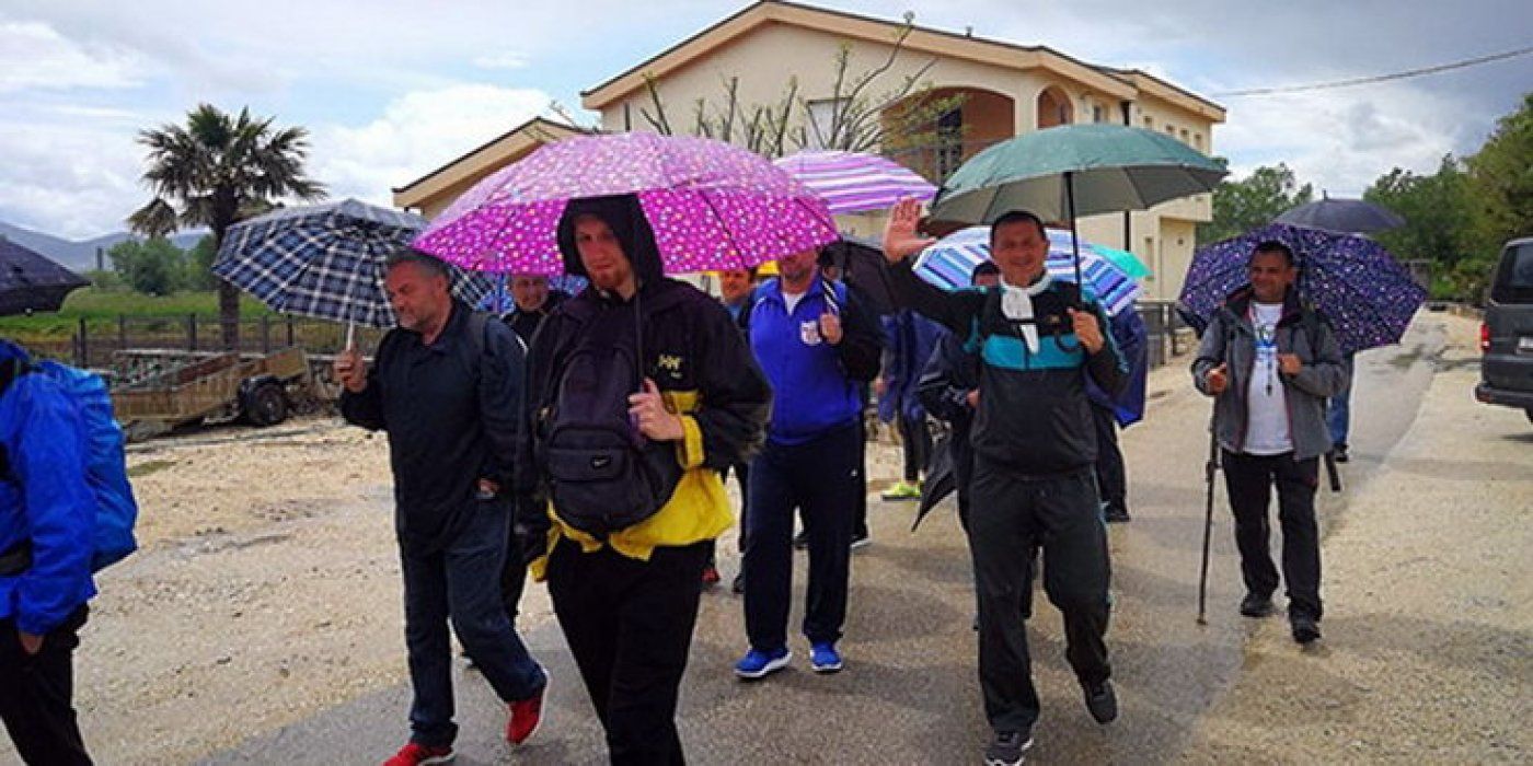 Ovih je dana kišno nevrijeme dovelo među nas, pod suhu nadstrešnicu, jednu skupinu muškaraca, koji već treći dan pješače iz Splita put Međugorja. Ubrzo saznajemo kako im treba naša točna lokacija kako bi ih pronašao kombi namijenjen za njihovu logistiku, natovaren vrećama za spavanje i rezervnom toplom odjećom i obućom.