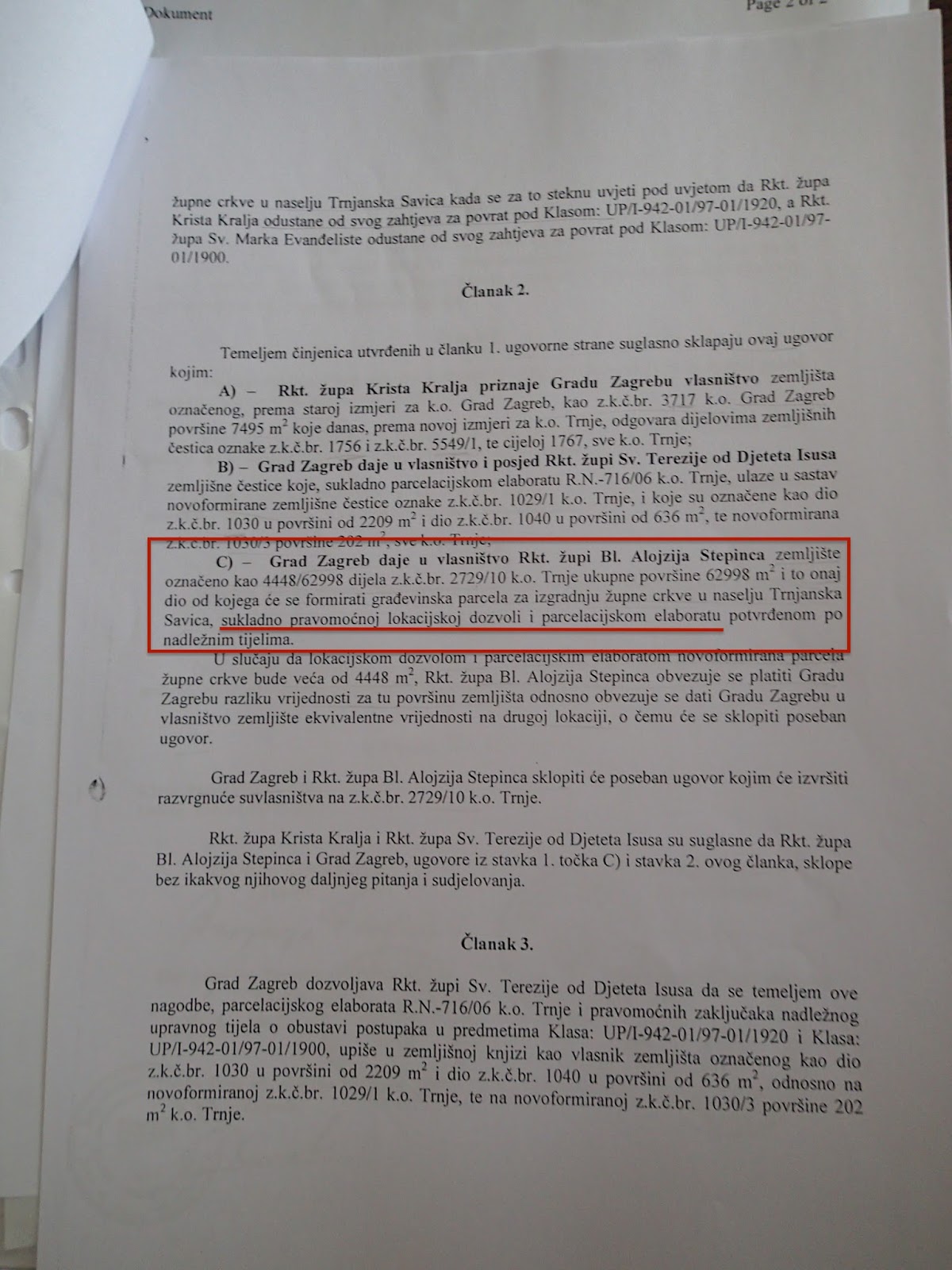 Kao što možemo vidjeti, članak 2., točka C) gore navedenog Ugovora napisan je u skladu sa zakonom, te se zbog zakonskih odredbi o načinu parcelacije zemljišta i gradnji Župa bl. Alojzija Stepinca nije mogla upisati kao vlasnik zasebne katastarske čestice u zemljišnim knjigama prije dobivanja pravomoćne Lokacijske dozvole i izrade i provedbe Parcelacijskog elaborata.