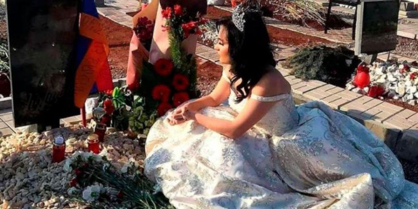 Mladenka nema vjenčani buket u rukama već stavlja cvijeće na očev grob i s tugom u očima iznosi svoje osjećaje nakon vjenčanja.