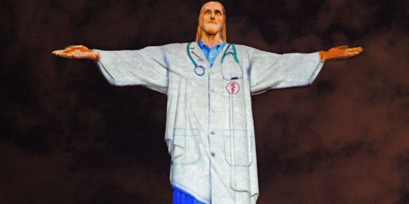 Kip Krista Otkupitelja zasvijetlio je za Uskrs „odjeven“ u bijeli liječnički ogrtač sa stetoskopom oko vrata kao znak podrške svim zdravstvenim radnicima za trud u borbi protiv koronavirusa COVID-19.