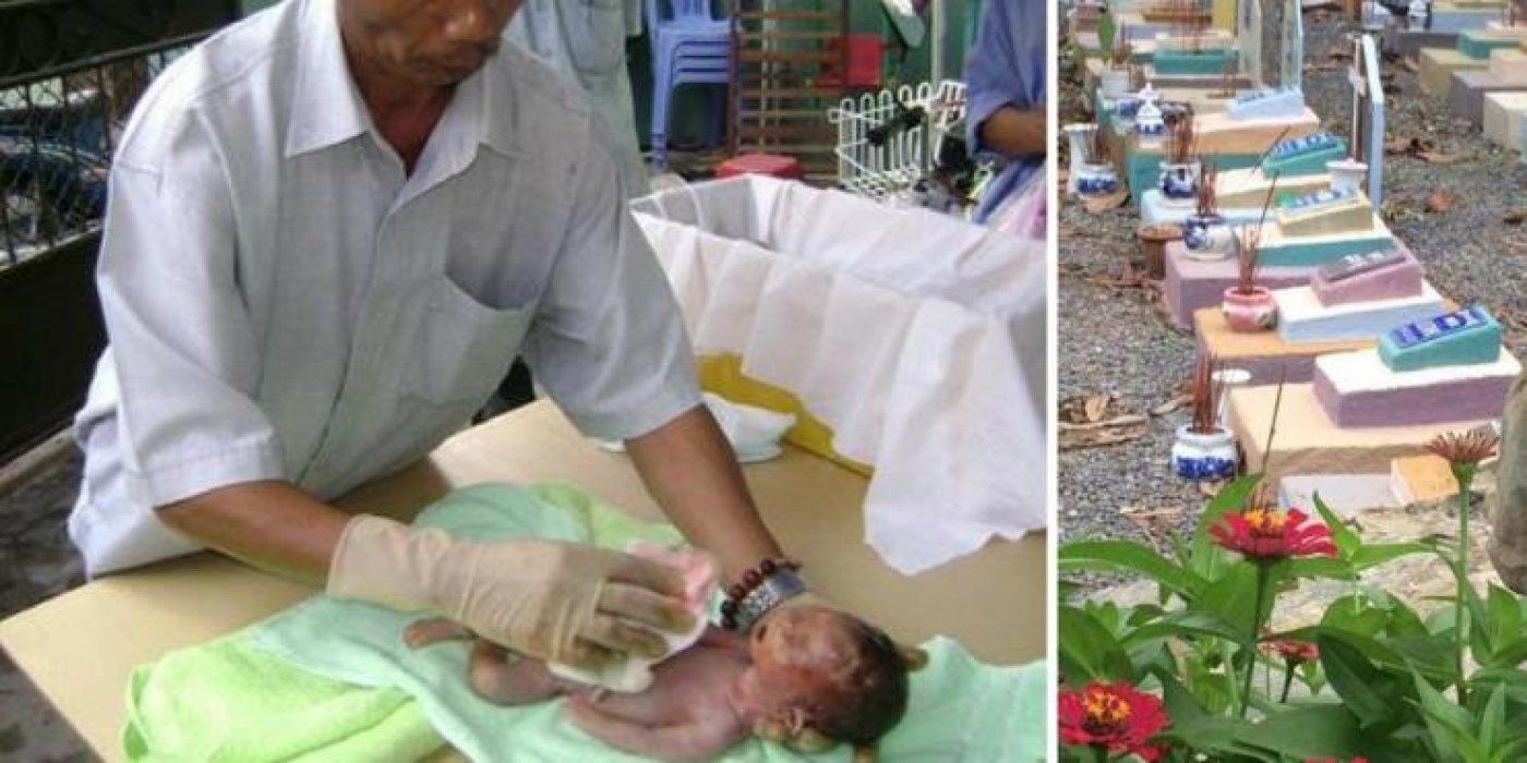 Tri godine kasnije otišao je u bolnicu i pitao može li uzeti njihova mrtva tijela ili ostatke kako bi barem imali pravi pogreb, jer ipak su to ljudska bića koja nisu zaslužila završiti u kanti za smeće. Ovaj bivši građevinski radnik uzeo je svu ušteđevinu i kupio zemljište na vrhu jedne planine. Počeo je neželjenu djecu tamo pokapati u minijaturnjim ljesovima. Često mu poteknu suze dok ih spušta u zemlju pa stane, obriše lice i pomoli se.Briše malo mrtvo tijelo prije pokopa.