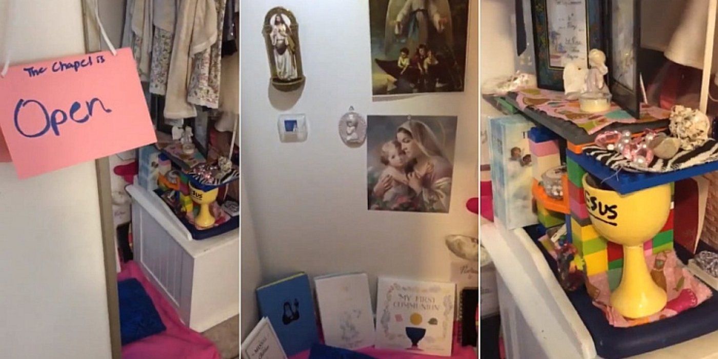 U videu majka djevojčice pokazuje kapelicu koju je njezina kći napravila u svom ormaru. Na vratima ormara nalazi se posuda sa svetom vodom, slika Blažene Djevice Marije s djetetom Isusom, slika anđela čuvara i raspelo. Na podu se nalaze neke vjerske knjige, a na polici improvizirani kalež.