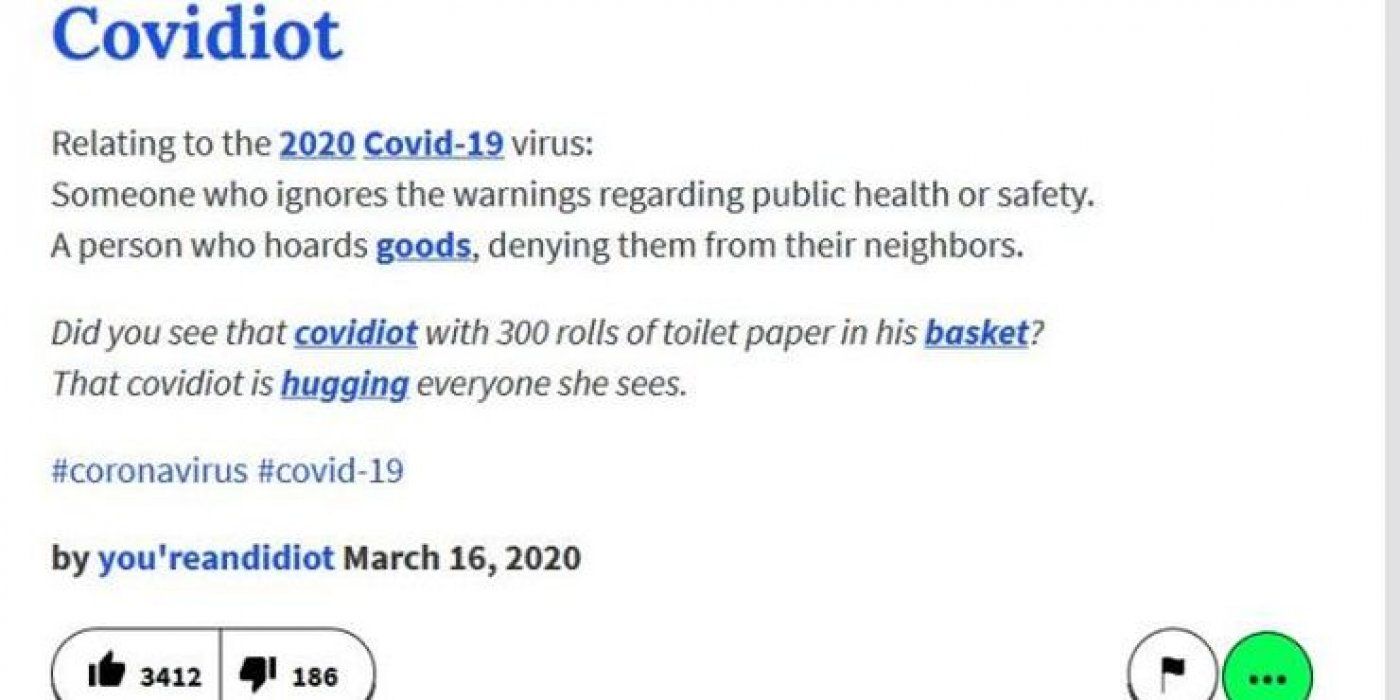 Na stranici Urban Dictionary se tako pojavio novi termin - kovidiot (covidiot), a označava ljude koji ignoriraju zdrav razum i savjete da ne putuju i da se nepotrebno ne socijaliziraju te one koji panično kupuju i gomilaju toaletni papir, sredstva za dezinficiranje i zaštitne maske.
